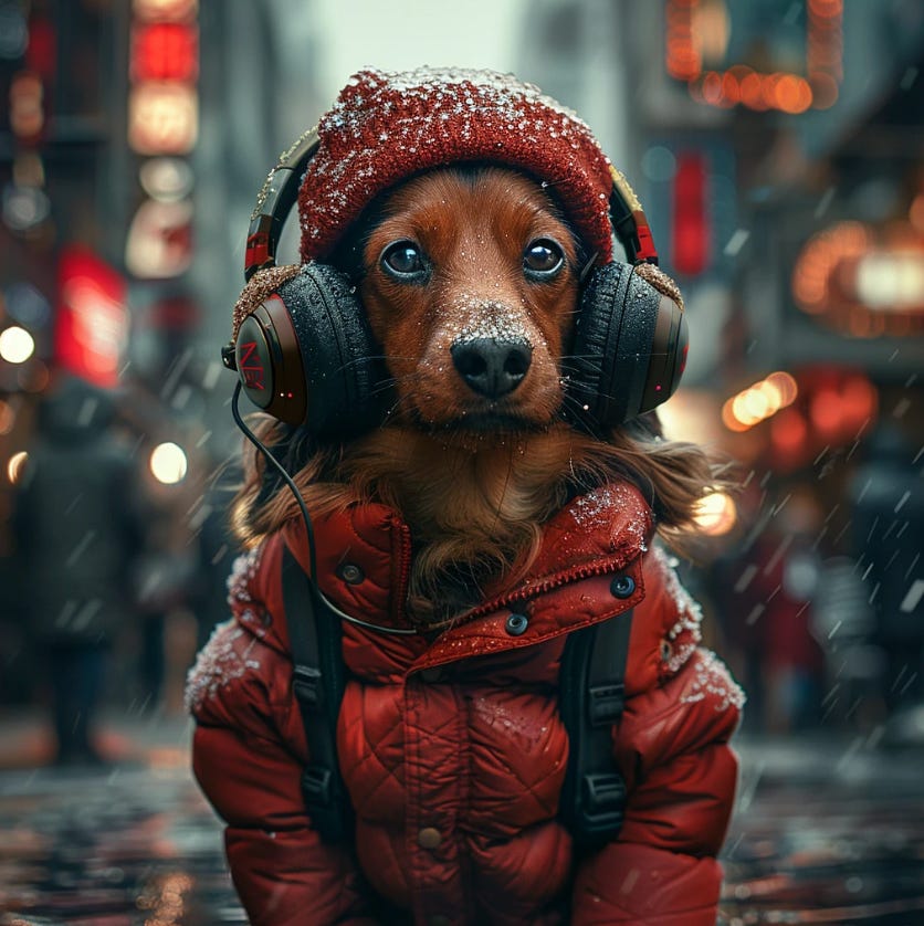 Dachshund dog, red, one eye blue, the other brown, wearing large Marshall headphones, a red down jacket, standing on the road against the backdrop of a rainy city, futuristic style --stylize 700.